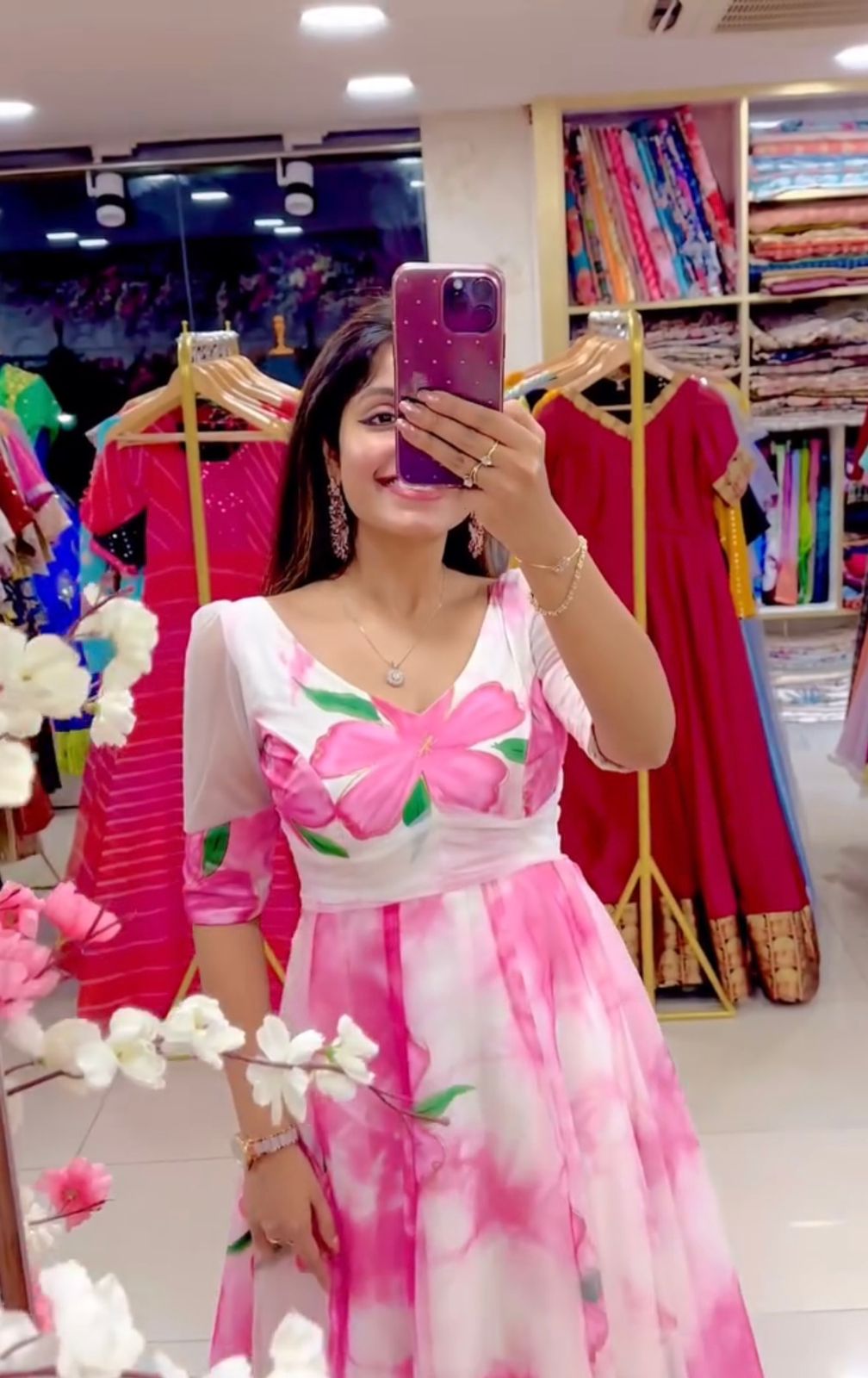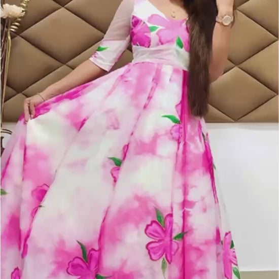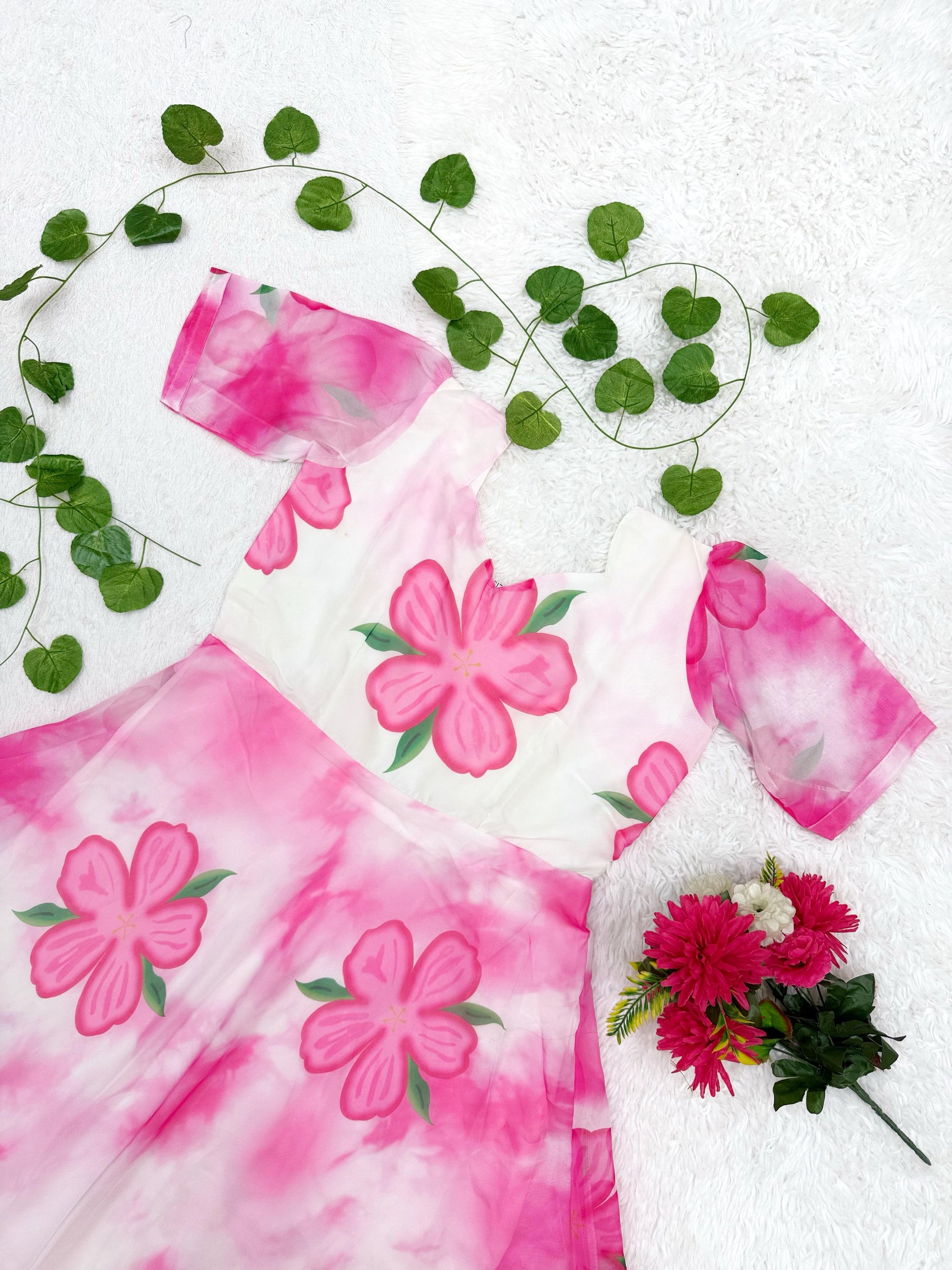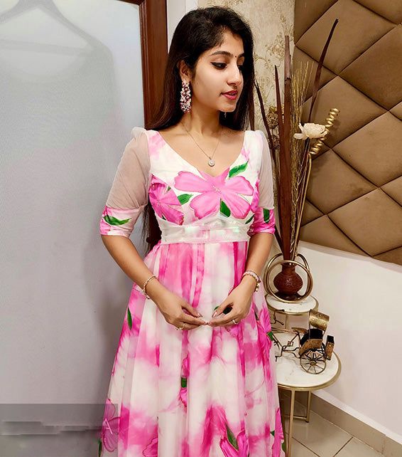 Elegant Pink Floral Soft Tabby Organza Gown - Free Size