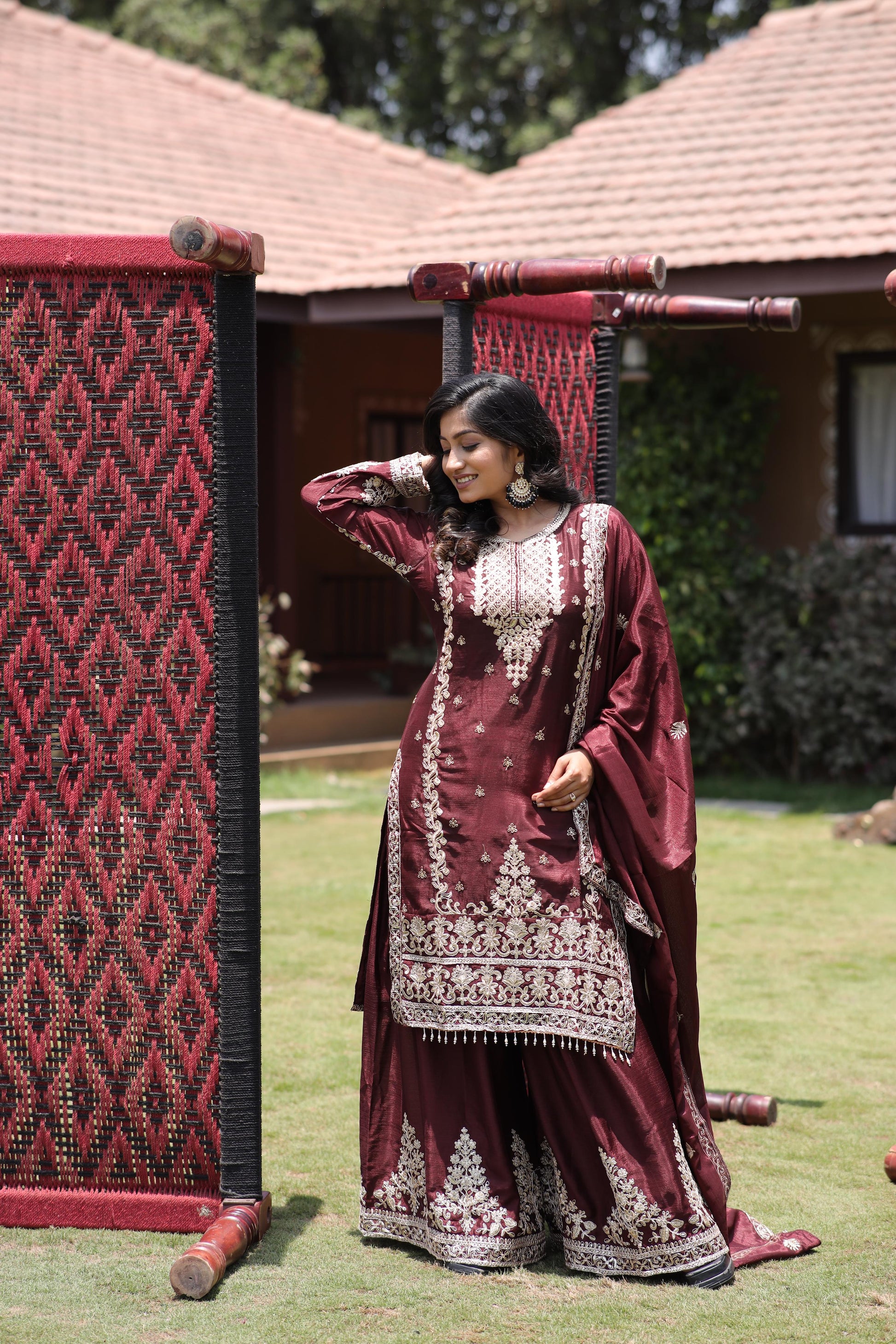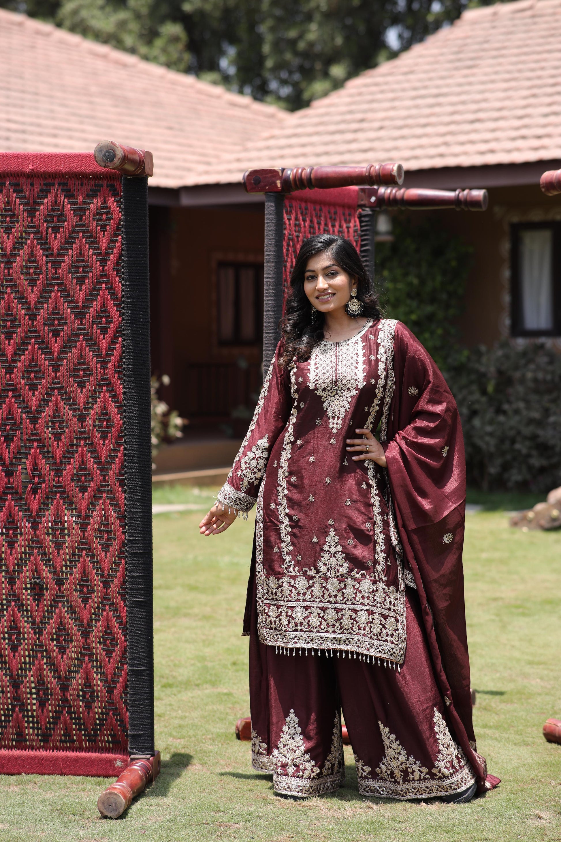 - Kurti: Crafted from luxurious Pure Chinon Silk fabric, fully stitched and lined with soft Micro Silk inner. Adorned with intricate Multi-Needle, Coding, and dazzling 5mm Sequins Embroidery work.